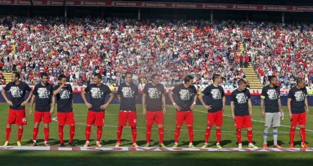 Tako je trebalo da bude i na Marakani, ali je zvanični spiker crveno – belih pored poziva na minut ćutanja za nastradale u poplavama, pozvao publiku da to učini i za dva ubijena člana navijačke grupe Delije, Velibora Dunjića i Marka Ševa.