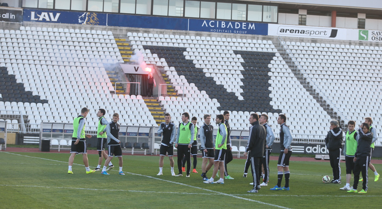 Navijači Partizana posetili su danas svoje ljubimce na treningu i častili ih bakljadom, kao i porukom na video-bimu.