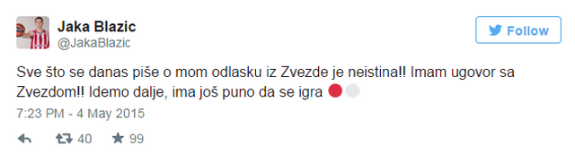 – Sve što danas piše o mom odlasku iz Zvezde je neistina. Imam ugovor sa Zvezdom. Idemo dalje, ima još puno da se igra – napisao je Blažič na Tviteru.