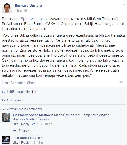 On je u razgovoru za hrvatske Sportske novosti otkrio da se ne slaže sa igranjem stranaca u reprezentaciji i priznao da u tom slučaju ne bi više igrao za Srbiju.