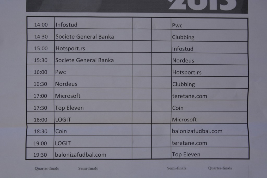 Titulu pobednika ‘Rekreativa’ braniće ekipa PwC (PricewaterhouseCoopers), koja je prošle godine u finalu pobedila ekipu Nielsen-a. Oni su i otvorili turnir protiv ekipe HotSport, a posle furioznog početka ekipe PwC i vođstva od 4:0, usledio je još furiozniji finiš naše ekipe, pa je meč završen rezultatom 4:4.