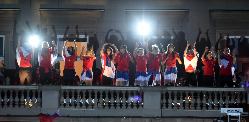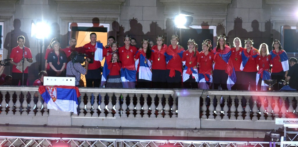 Košarkašice su na terasu Starog dvora izašle sa srpskim zastavama i krunama, a pored junakinja Ane i Milice Dabović, ‘spleš sisters’ kako ih je oslovio kolega Slobodan Šarenac, velike ovacije dobila je i Danijel Pejdž, popularna Daca.