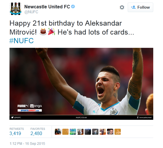 – Srećan 21. rođendan Aleksandru Mitroviću! Dobio je dosta čestitki (kartona)… – jasna je dvosmislenost ove poruke, sa aluzijom na disciplinske mere koje je Srbin dobijao u prethodnom periodu u Njukaslu.