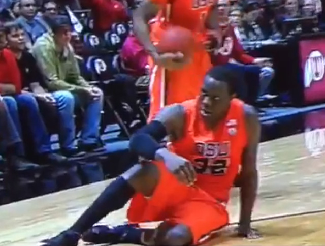 Besan zbog odluke sudije da ne dosudi prekršaj nad njim košarkaš Oregon Stejt Univeziteta Džarmal Rid klizećim startom pokazao je šta misli o tome. Nakon što je ukrao loptu protivniku Džarmal je pod kontaktom pao, ali arbitar je smatrao da tu nije bilo kršenja pravila i krenuo je da prati akciju dalje. Ali ne zadugo…