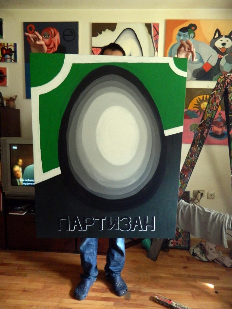 – Kad god odem na stadion vidim da mladi ljudi imaju poseban umetnički izraz koji iskazuju kroz pesmu, koreografiju,zastave…To je njihov doprinos umetnosti. Kao navijač, i pre svega profesionalni slikar, želeo sam na svoj način da i ja iskažem ono što osećam kroz neku vrstu umetničkog transparenta. Tako je nastala i ova slika – objašnjava Moma Bjeković, čija su dela kako kaže, slobodna interpretacija sveta, a ne puki prikaz stvarnosti.
