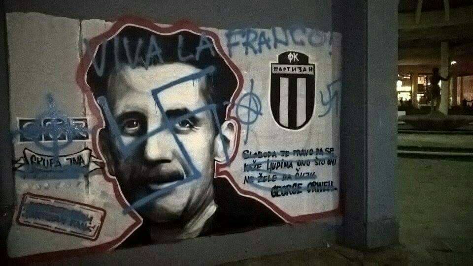 Preko murala posvećenom engleskom piscu Džordžu Orvelu danas je osvanuo kukasti krst, kao i natpis „viva la franco“.
