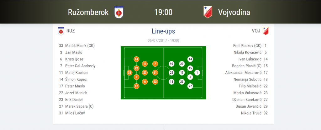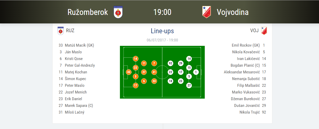 Poznati su i sastavi za ovaj meč, a Vojvodina će na stadionu u Ružomberoku izaći u sledećem sastavu: Emil Rockov, Nikola Kovačević, Ivan Lakićević, Bogdan Planić, Aleksandar Mesarović, Nemanja Subotić, Filip Malbašić, Marko Vukasović, Dženan Bureković, Dušan Jovančić, Nikola Trujić.