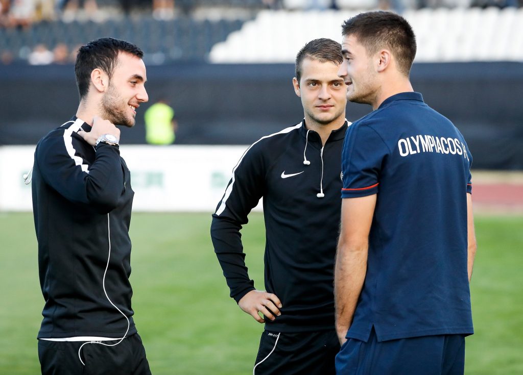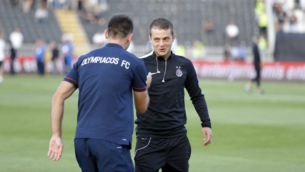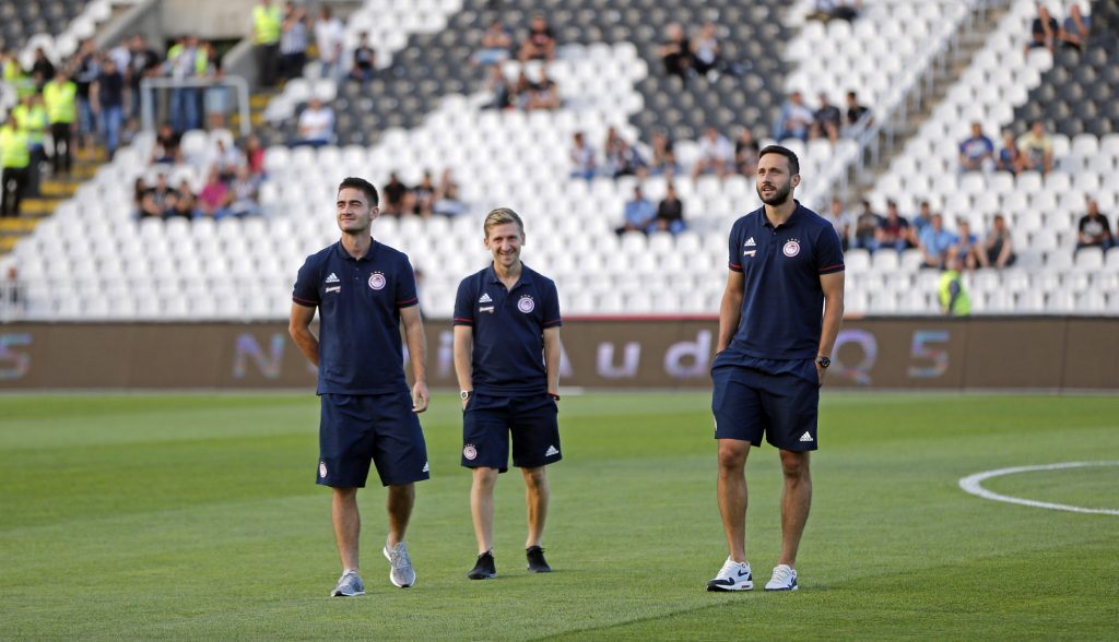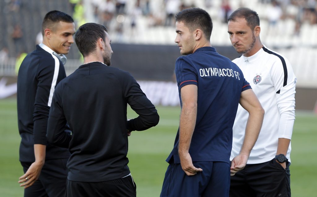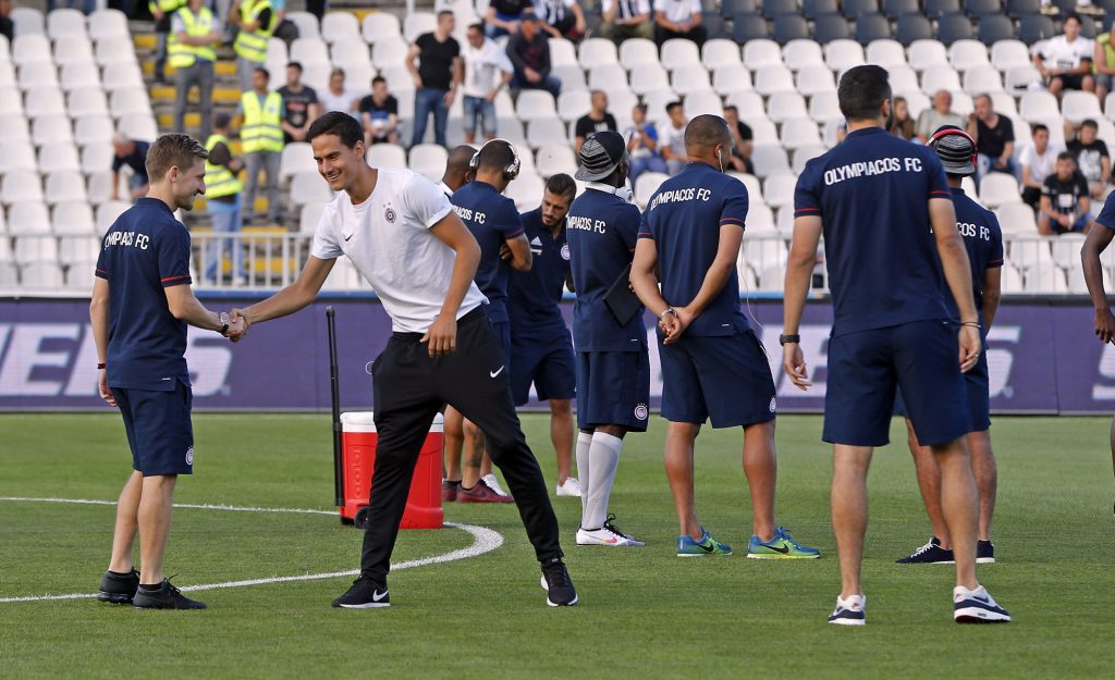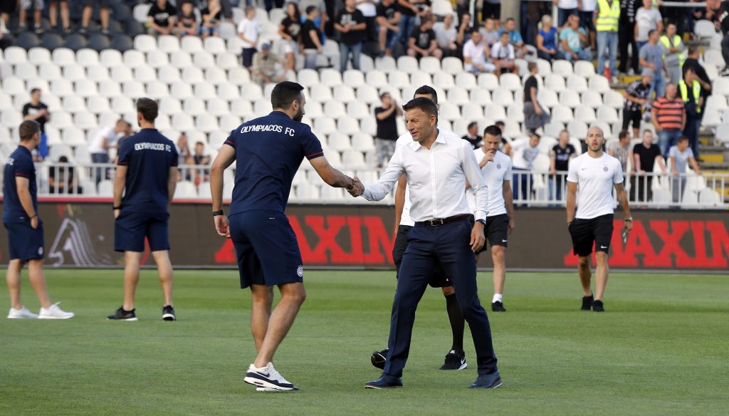 Dok su se fudbaleri Partizana lagano zagravali, na travnati tepih su izašli i fudbaleri Olimpijakosa. Srpskom reprezentativcu Jagošu Vukoviću prvi je prišao trener crno-belih Miroslav Đukić, zatim i ostali fudbaleri Partizana. Neca Mihajlović i Marko Janković su razgovarali sa Sašom Zdjelarom. Sve to iz svečane lože je posmatrao legendarni centarfor Crvene zvezde Darko Kovačević. Pogledajte galeriju sa stadiona u Humskoj: