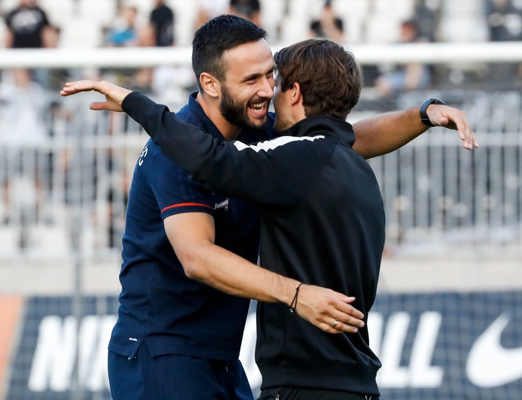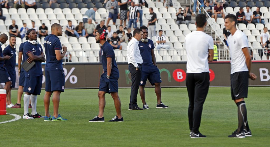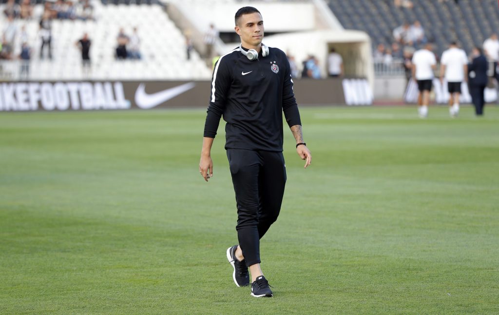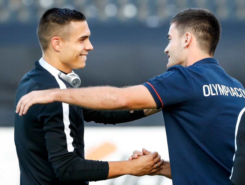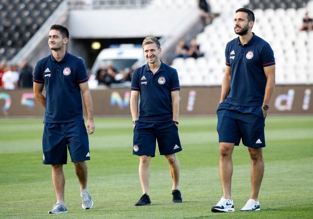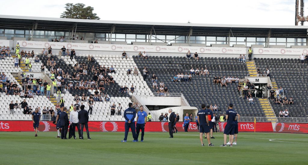 Dok su se fudbaleri Partizana lagano zagravali, na travnati tepih su izašli i fudbaleri Olimpijakosa. Srpskom reprezentativcu Jagošu Vukoviću prvi je prišao trener crno-belih Miroslav Đukić, zatim i ostali fudbaleri Partizana. Neca Mihajlović i Marko Janković su razgovarali sa Sašom Zdjelarom. Sve to iz svečane lože je posmatrao legendarni centarfor Crvene zvezde Darko Kovačević. Pogledajte galeriju sa stadiona u Humskoj: