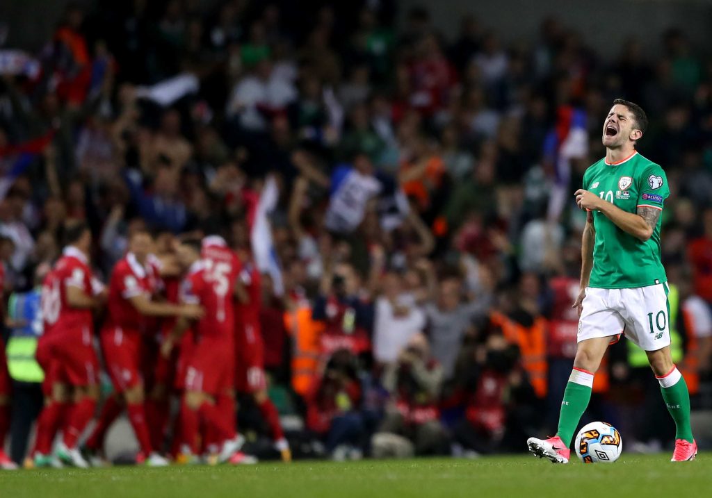 Ireland’s Robbie Brady dejected as Serbia celebrate the opening goal