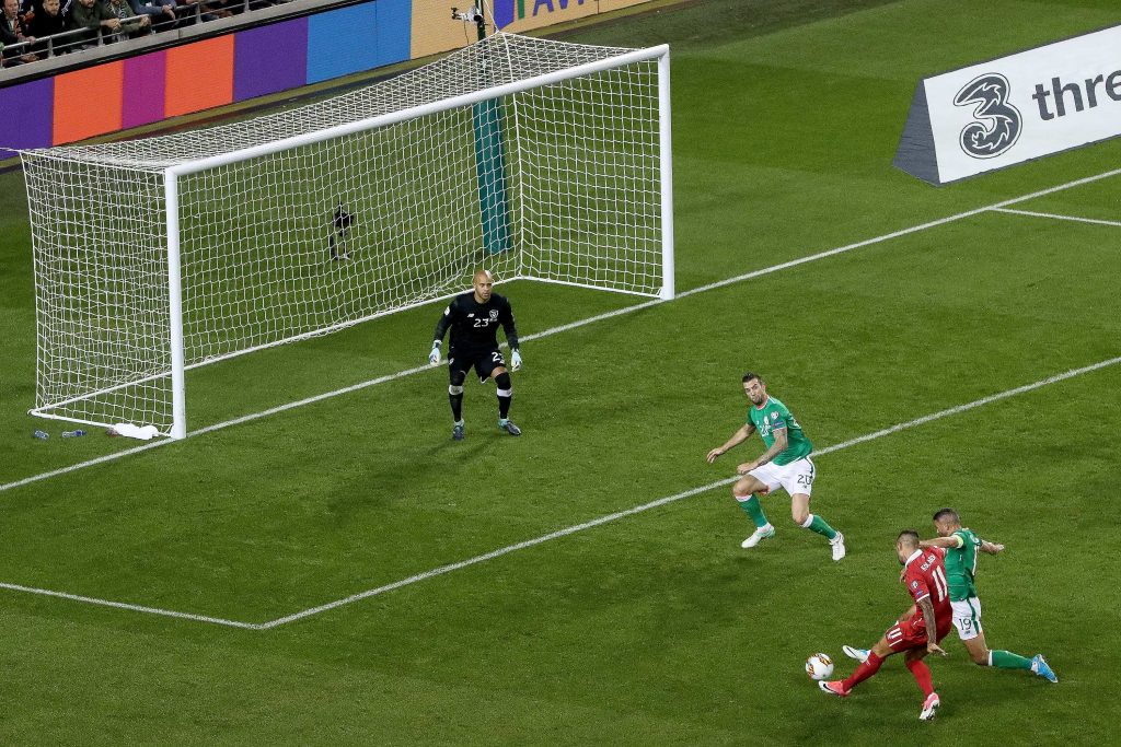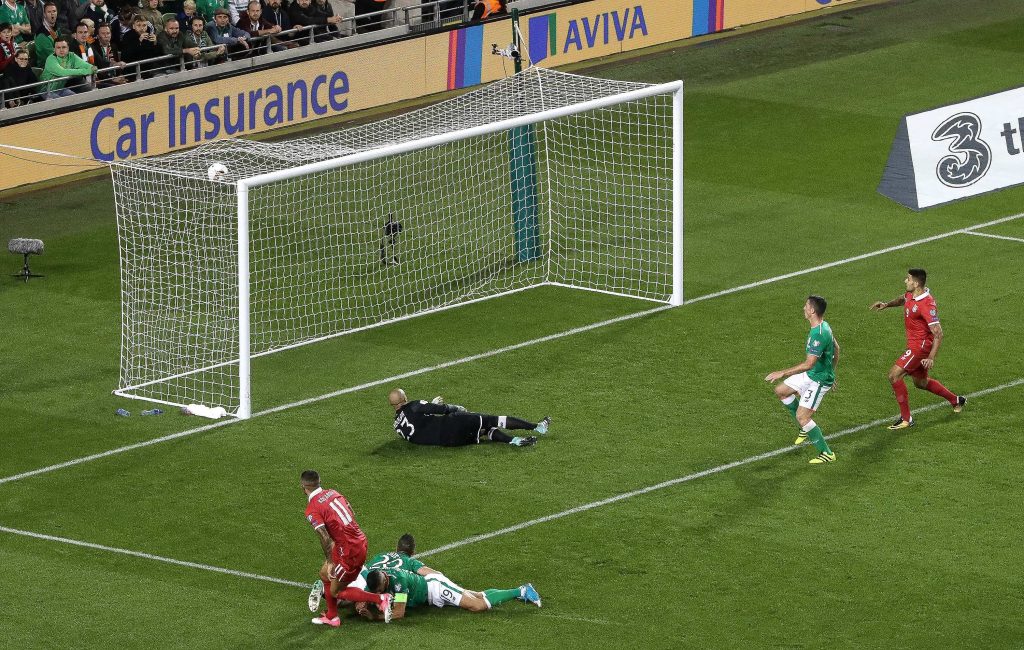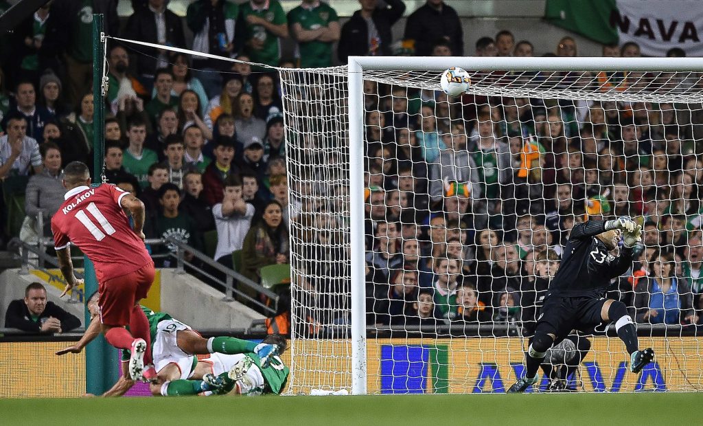 Ireland goalkeeper Darren Randolph fails to stop a shot by Aleksandar Kolarov of Serbia