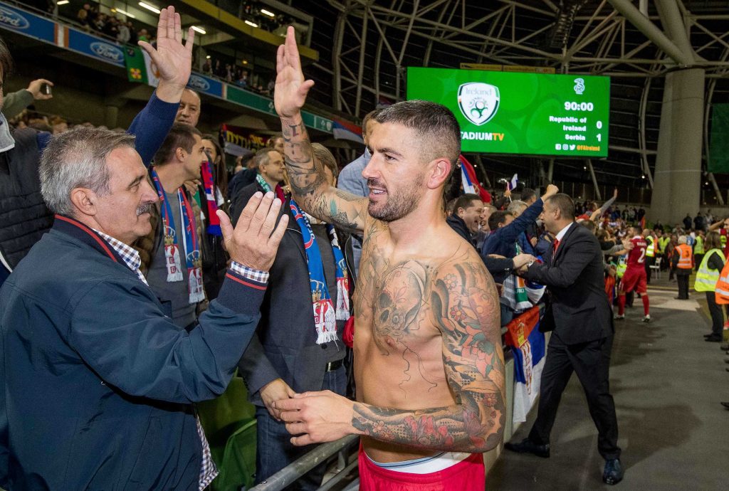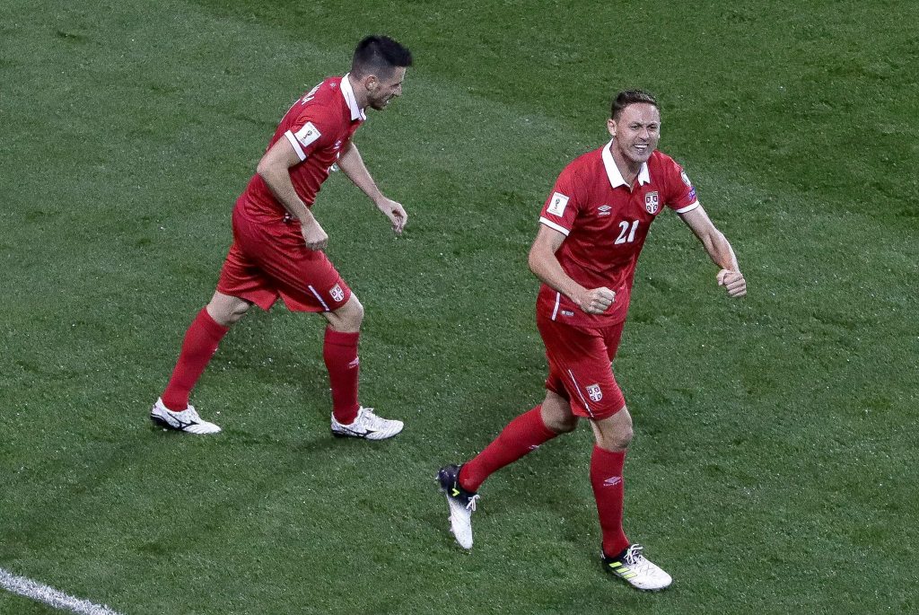 Serbia goal scorer Aleksandar Kolarov celebrates after the game