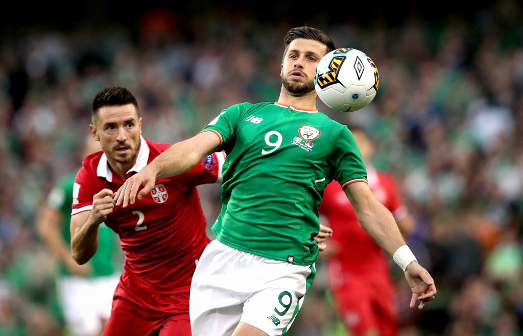 IrelandÕs Shane Long with Antonio Rukavina of Serbia