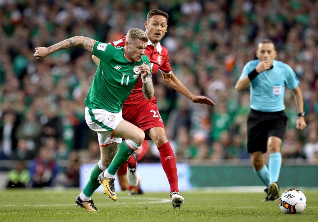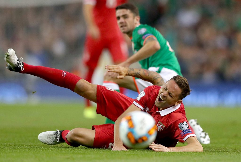 IrelandÕs Daryl Murphy tackled by Nikola Maksimovic of Serbia