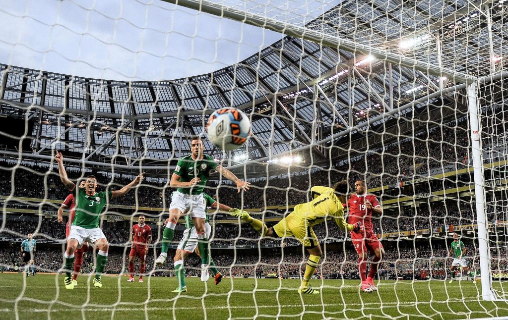 Irelands Shane Duffy scores a goal that was subsequently disallowed for offside