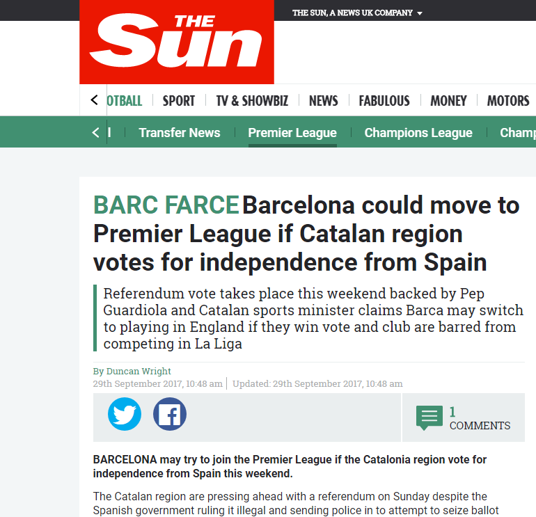 Barselona bi mogla da napusti Primeru i preseli se u jednu od liga ‘petice’. Naime, kako javlja britanski tabliod ‘San’ u slučaju da se Katalonija na referendumu u nedelju ocepi od Španije, Barselona bi mogla da bira u kojoj će se ligi takmičiti. U opciji su Premijer liga, Liga jedan i Serija A. Naravno, može i da ostane u Primeri i nastavi bitke sa Real Madridom.