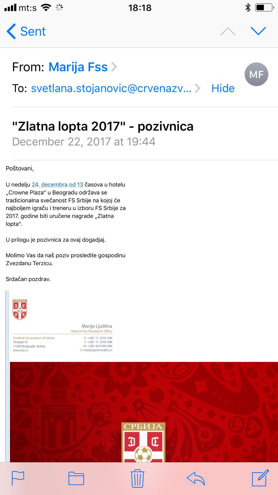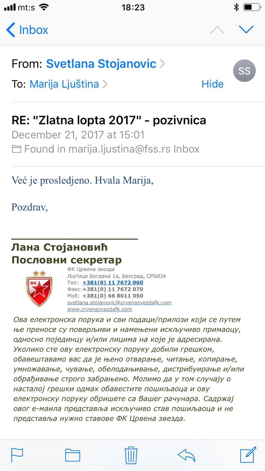 – U vezi sa brojnim pozivima koje sam dobio od različitih medija, kao portparol FS Srbije obaveštavam vas da je FK Crvena zvezda uredno dobila poziv mejlom na svečanost „Zlatna lopta“ o čemu pretpostavljam portparol FK Crvena zvezda nije bio blagovrenemo obavešten i kako bismo izbegli bilo kakvu konfuziju u vezi sa ovom temom, molim vas da objavite sve što je ovde navedeno kao moju izjavu. Takodje u prilogu imate dokumenta koja potvrđuju da je rukovodstvo FK Crvena zvezda pozvano na svečanost, stoji u izjavi Vukovića.