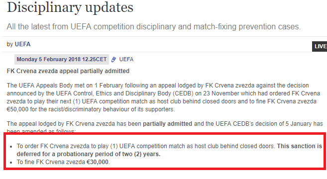 UEFA je na svom zvaničnom portalu za izricanje kazni potvrdila da će Crvena zvezda dočekati CSKA iz Moskve sa navijačima.