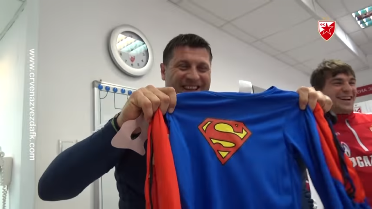 Trener crveno-belih Vladan Milojević proslavio je 48. rođendan. Posle porodice, šefu stručnog štaba prvo su čestitali igrači. Milojević je dobio prvo tortu, a onda i originalan poklon. Odelo Supermena. Evo kako je danas bilo u svlačionici Crvene zvezde.