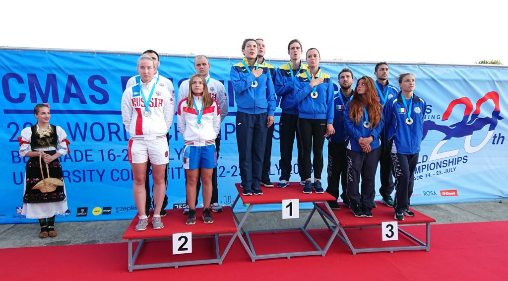 U štafeti 4×2000 metara trijumfovao je tim Ukrajine, drugo mesto osvojila je Rusija, dok je bronza pripala Italiji. Takmičenjima na Adi završeno je 20. CMAS Svetsko prvenstvo u plivanju perajima i brzinskom ronjenju za seniore – Beograd.