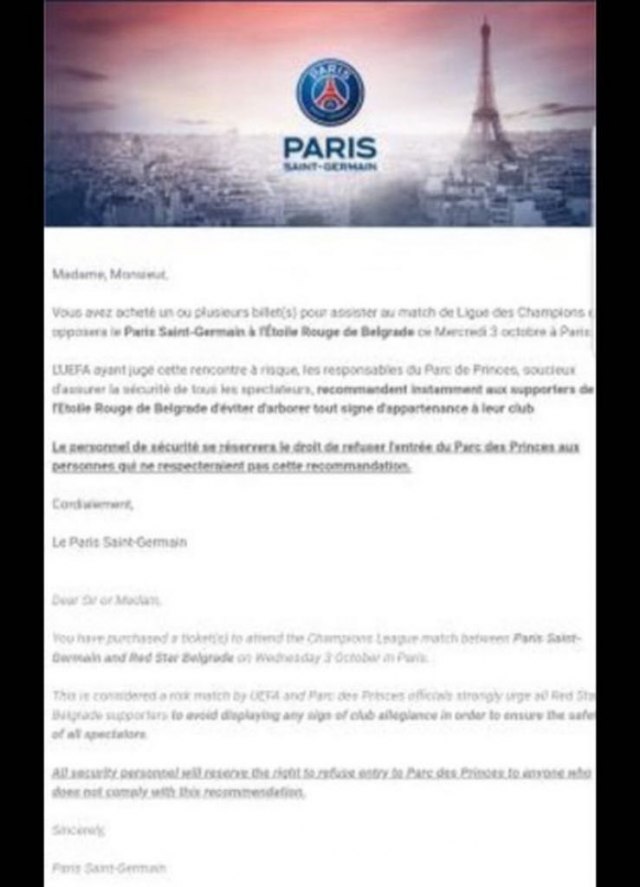 – Poštovani, kupili ste ulaznicu za meč Lige šampiona između PSŽ-a i Crvene zveezde 3. oktobra u Parizu. Ovaj meč UEFA je proglasila riskantnim i moramo da apelujemo na sve navijače Crvene zvezde da izbegnu predstavljanje obeležja klubova kako bi se osigurala bezbednost svih gledalaca. Svi zaposleni u bezbednosnom sektoru zadržaće pravo da zabrane ulaz gledaocima za koje se proceni da su se oglušili o ovu preporuku, preneo je Telegraf.