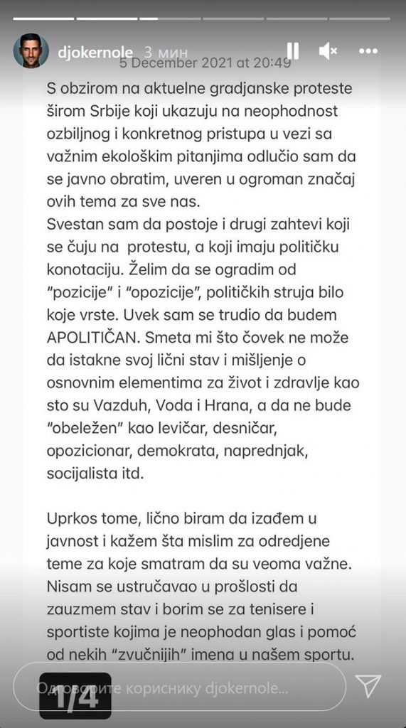 Protesti građana Srbije su nešto što je obeležilo nedelju koja je na izmaku. Novak Đoković je u subotu kratko porukom podržao narod koji je izašao na ulice: