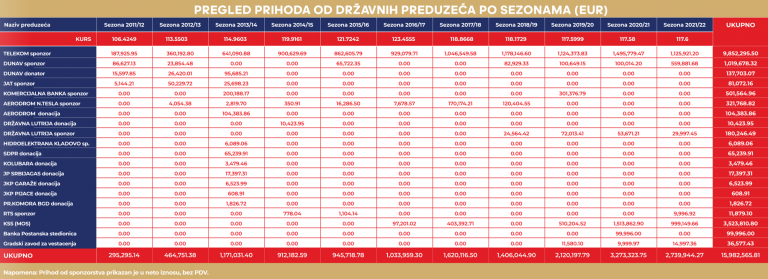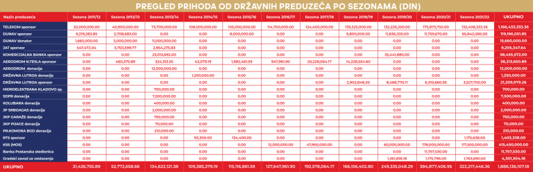 Te stavke (prihodi od RS, grada Beograda i državnih preduzeća) mogu se videti i kao odvojene tabele u okviru tabela br. 3 i br. 4 (suma i procentualni udeo učešća u prihodu kluba).
