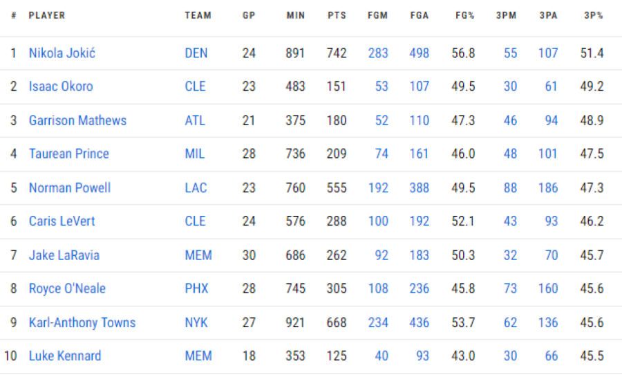 Iako nije na vrhu po broju ubačenih trojki, Jokić trenutno beleži neverovatnu uspešnost od 51,4% u šutu za tri poena, sa 55 pogođenih iz 107 pokušaja, što ga čini najpreciznijim trojkašem u ligi. Ovaj procenat ga svrstava ispred specijalista kao što su Ajzak Okoro (49,2%), Gerison Metjuz (48,9%) i Torijan Prins (47,5%).