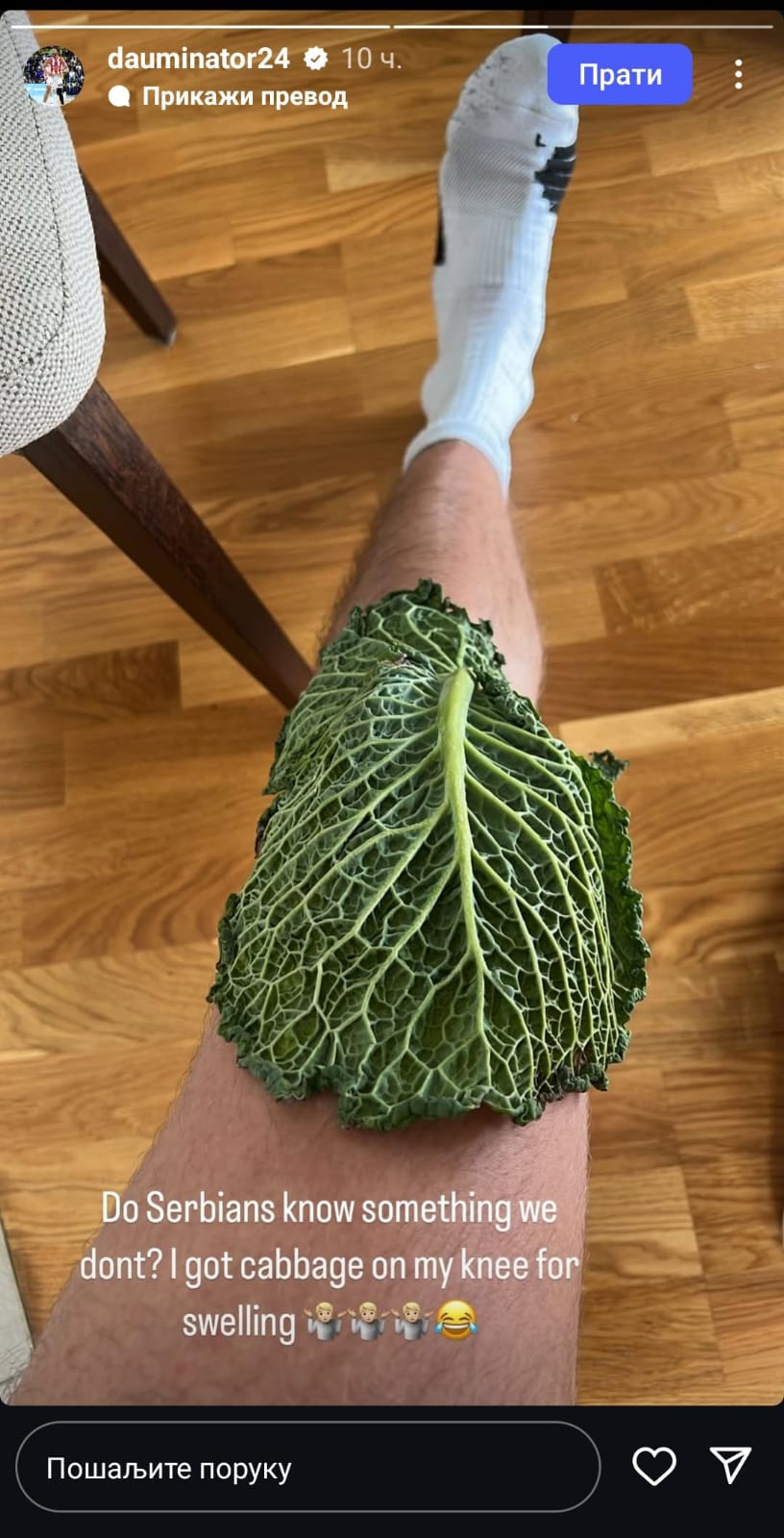 Košarkaš Crvene zvezde, Majk Daum, koji se već duže vreme oporavlja od povrede kolena, nasmejao je svoje pratioce na Instagramu neobičnom objavom. Naime, Daum je podelio fotografiju svog otečenog kolena sa listom kupusa preko njega i uz šaljiv komentar napisao: