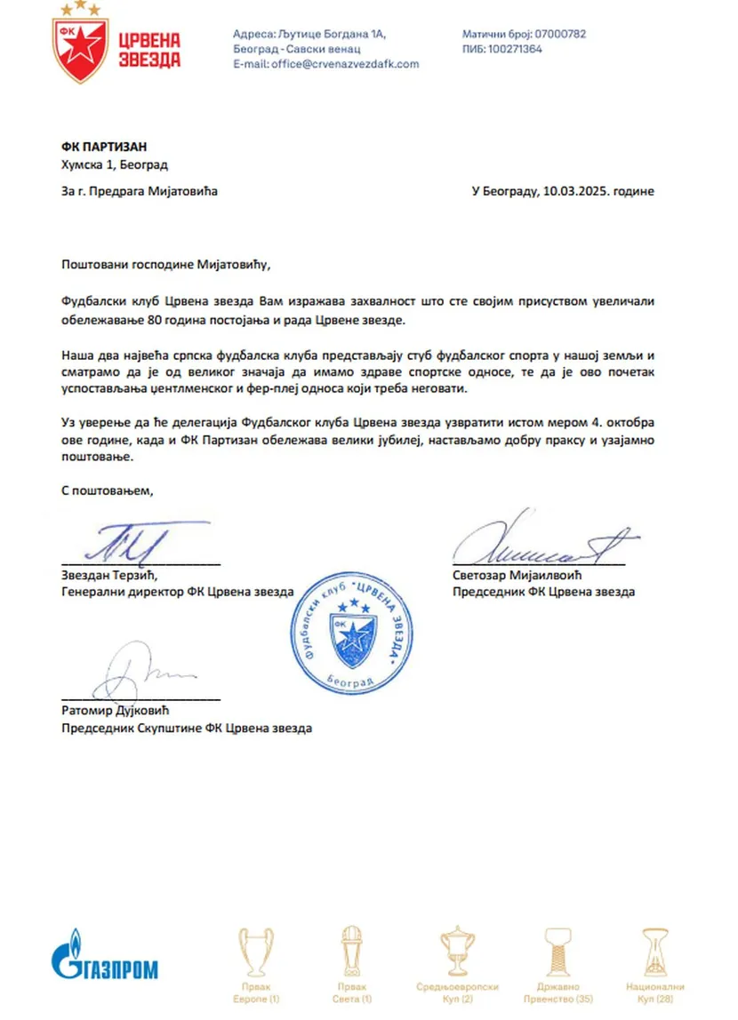 Crvena zvezda uputila je zvanično pismo Predragu Mijatoviću kao znak zahvalnosti za njegovo prisustvo na proslavi 80. rođendana kluba.