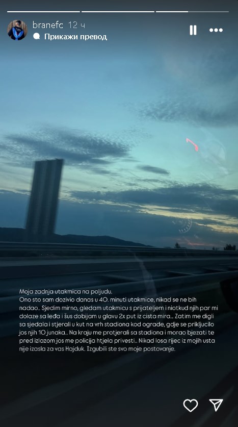 – Moja zadnja utakmica na Poljudu. Ono što sam doživeo danas u 40. minutu, nikada ne bih očekivao. Sedim mirno, gledam utakmicu s prijateljem, kad mi par njih dolazi s leđa i dobijam udarac u glavu ni kriv ni dužan. Zatim su me digli sa sedišta, stisli u ugao kod ograde i pridružilo im se još desetak „junaka“. Na kraju su me oterali sa stadiona, morao sam bežati ka izlazu, a policija me još htela privesti – napisao je Brane na svom Instagram nalogu.