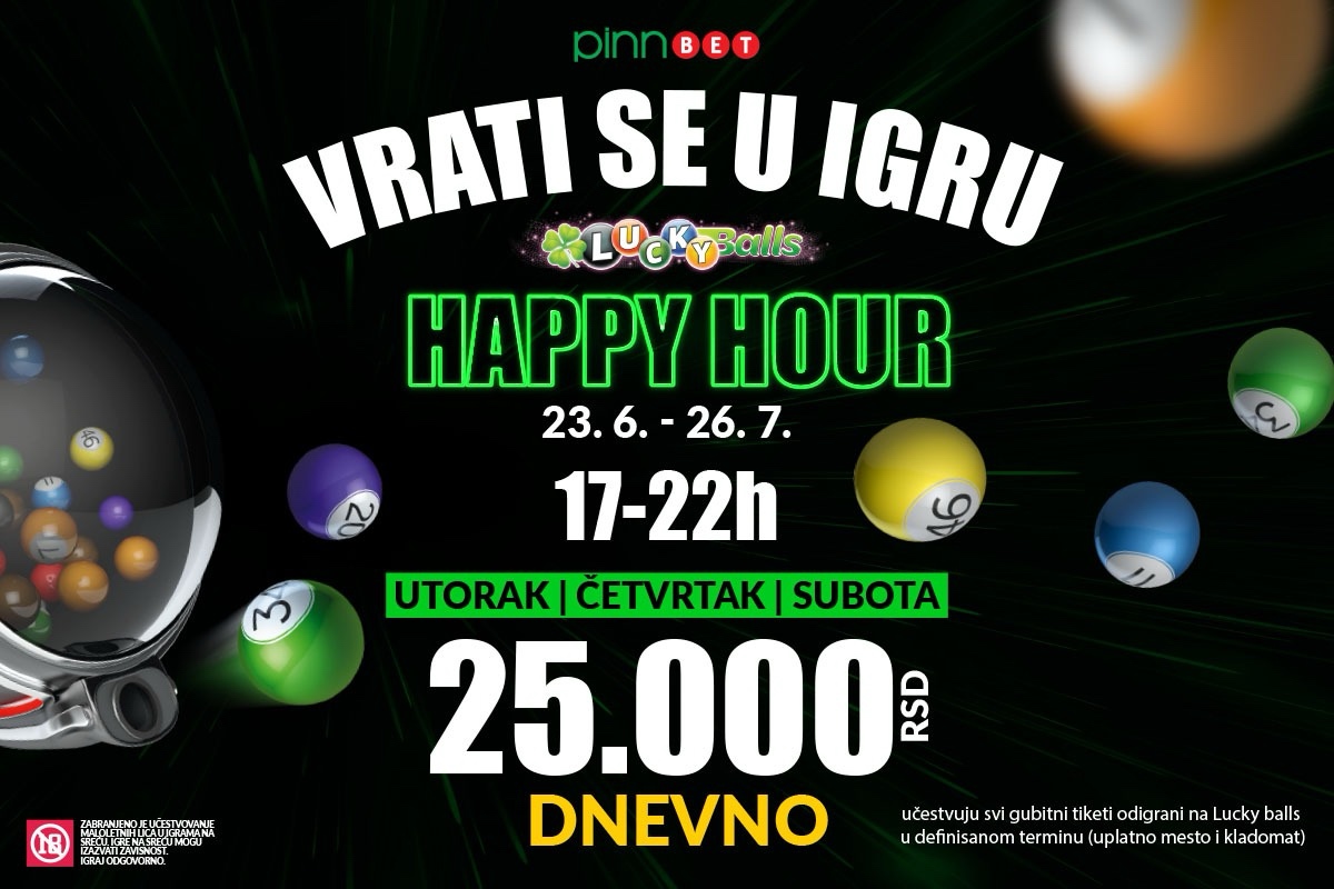 Tokom Happy Hour termina od 17 do 22 časova, dovoljno je da u bilo kom PinnBet lokalu odigrate Lucky Balls tiket, i već ste kvalifikovani za džekpot koji vas vraća u igru!