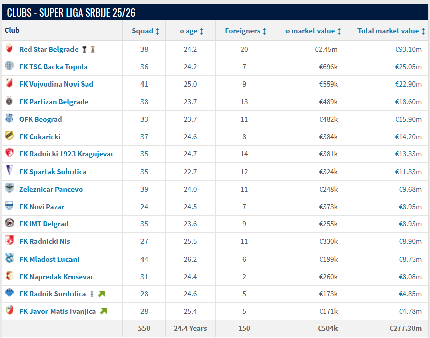 Transfermarkt je objavio ažuriranu listu tržišnih vrednosti superligaških klubova, a Partizan je rangiran iza Crvene zvezde, TSC-a i Vojvodine. Lider liste je Crvena zvezda sa 93.100.000 evra, dok TSC zauzima drugo mesto sa 25.050.000 evra, a Vojvodina treće sa 22.900.000 evra.