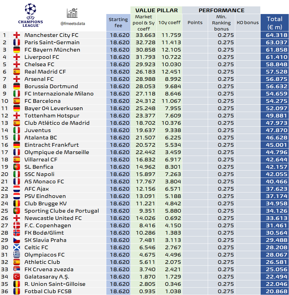 Starting positions for Top 10 clubs in 2025/26 UCL prize money rankings (in EUR):