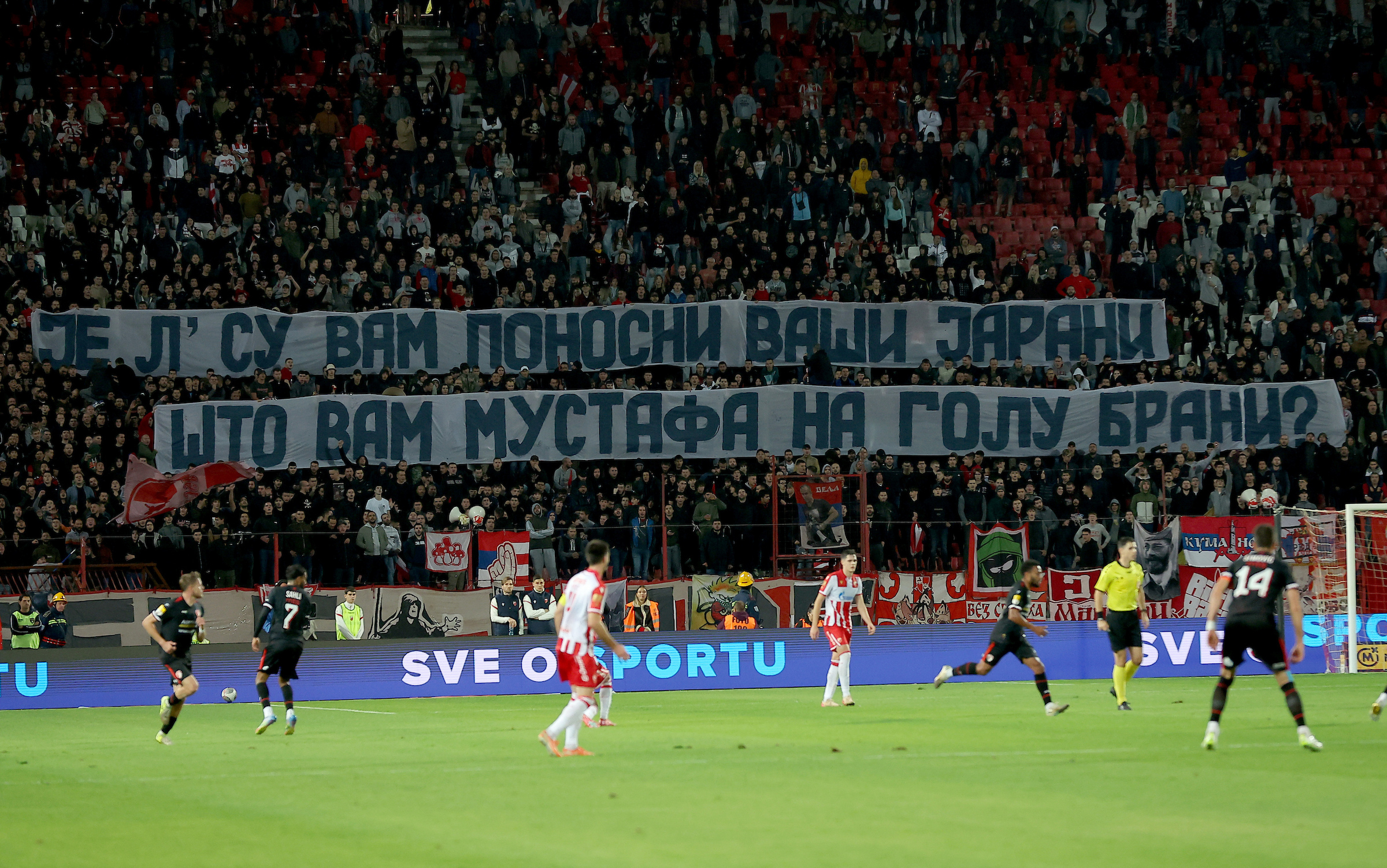 Ono što je dovelo do transparenta na kome je pisalo: „Je l’ su vam ponosni vaši jarani što vam Mustafa na golu brani?„, jeste sitacija iz Sarajeva.