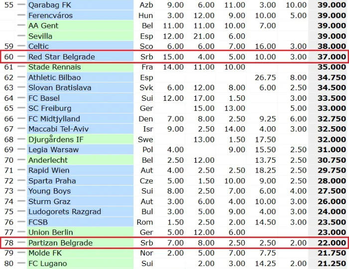Poslednjih nekoliko sezona srpski klubovi beleže slab učinak, a Partizan i ostali timovi donose minimalne bodove, dok Zvezda nosi teret očuvanja položaja na UEFA listi. Sledeće sezone može se očekivati pad još desetak mesta zbog ispada rekordnih 15,000 bodova iz obračuna.