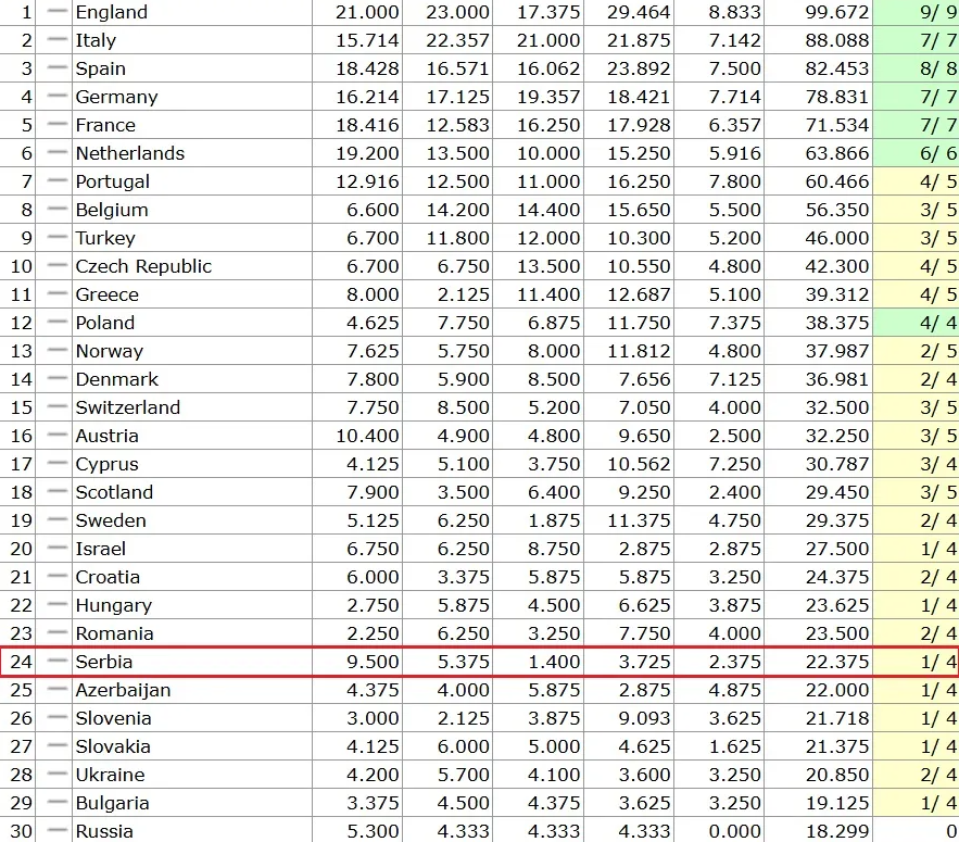 Bez toga, opstanak u društvu 24 najjače lige Evrope biće izuzetno težak, a pad ispod 30. mesta nije isključen, što bi bio najgori plasman još od devedesetih.
