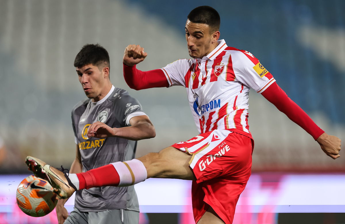 Marko Rakonjac (R) during the Mozzart Super Liga match between Crvena Zvezda and Radnicki 1923 at stadium Rajko Mitic (Marakana) on April 10, 2023 in Belgrade, Serbia. (Photo by Srdjan Stevanovic/Starsport.rs ©)
