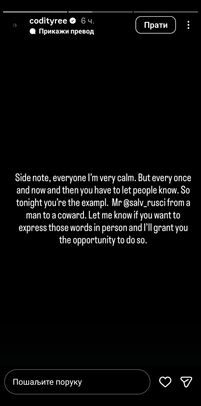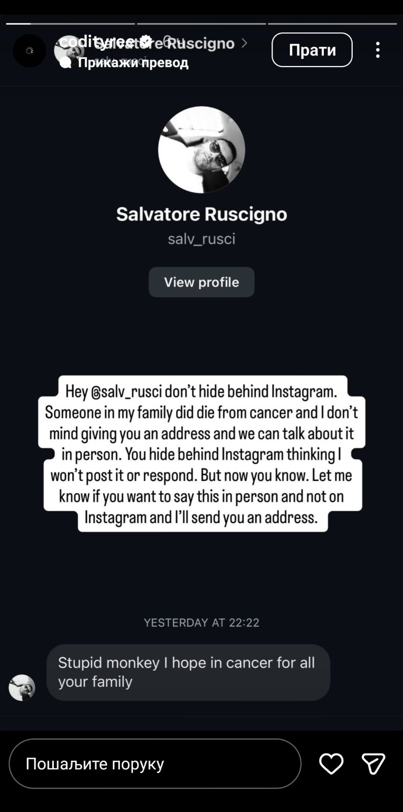 – „Hej, nemoj da se kriješ iza Instagrama. Neko iz moje porodice je zaista preminuo od raka i nemam problem da ti dam adresu pa da o tome razgovaramo uživo. Kriješ se iza Instagrama misleći da to neću objaviti ili da neću odgovoriti. Ali sada znaš. Javi mi ako želiš da ovo kažeš lično, a ne preko Instagrama, i poslaću ti adresu.