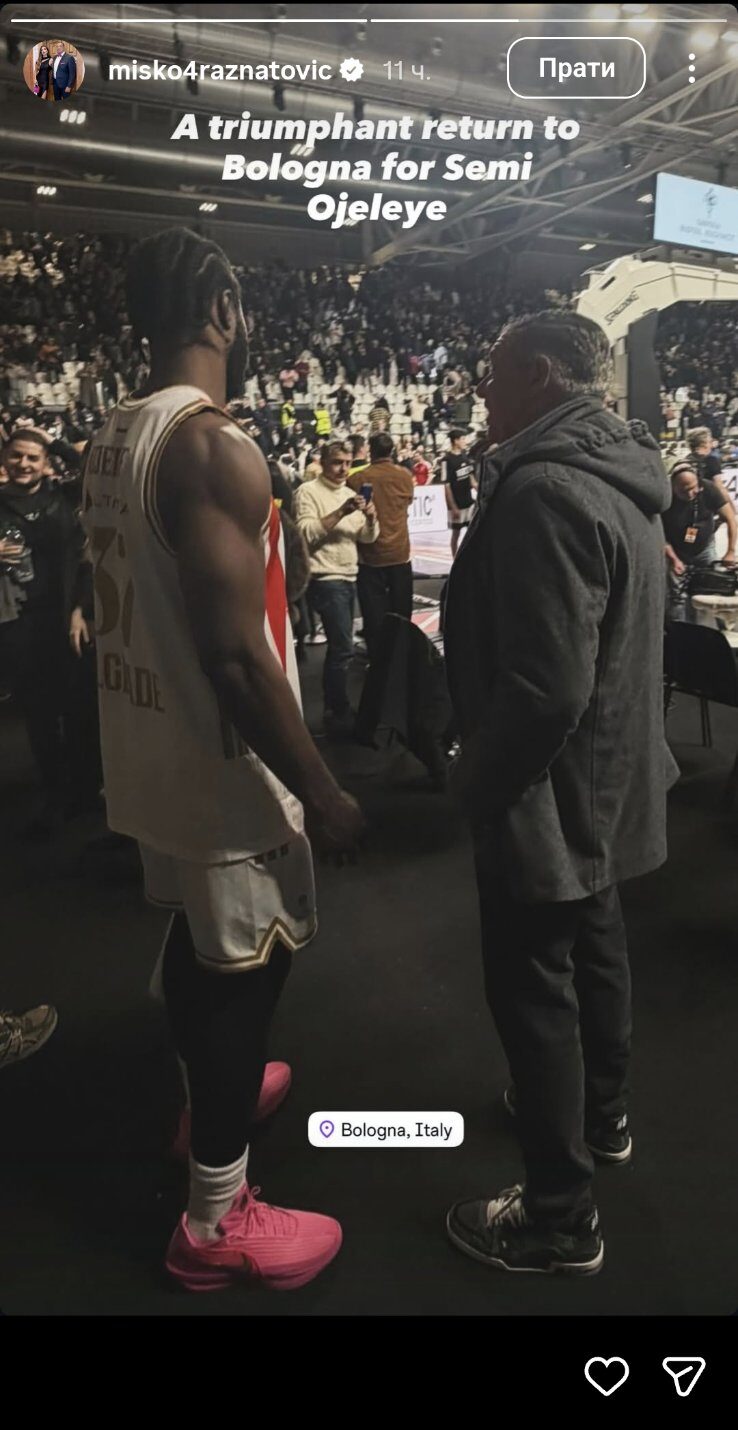Duel u Bolonji imao je i dodatnu simboliku, pošto je sa tribina meč pratio i Miško Ražnatović, Odželejev agent, koji je kasnije na društvenim mrežama podelio zajedničku fotografiju uz opis: