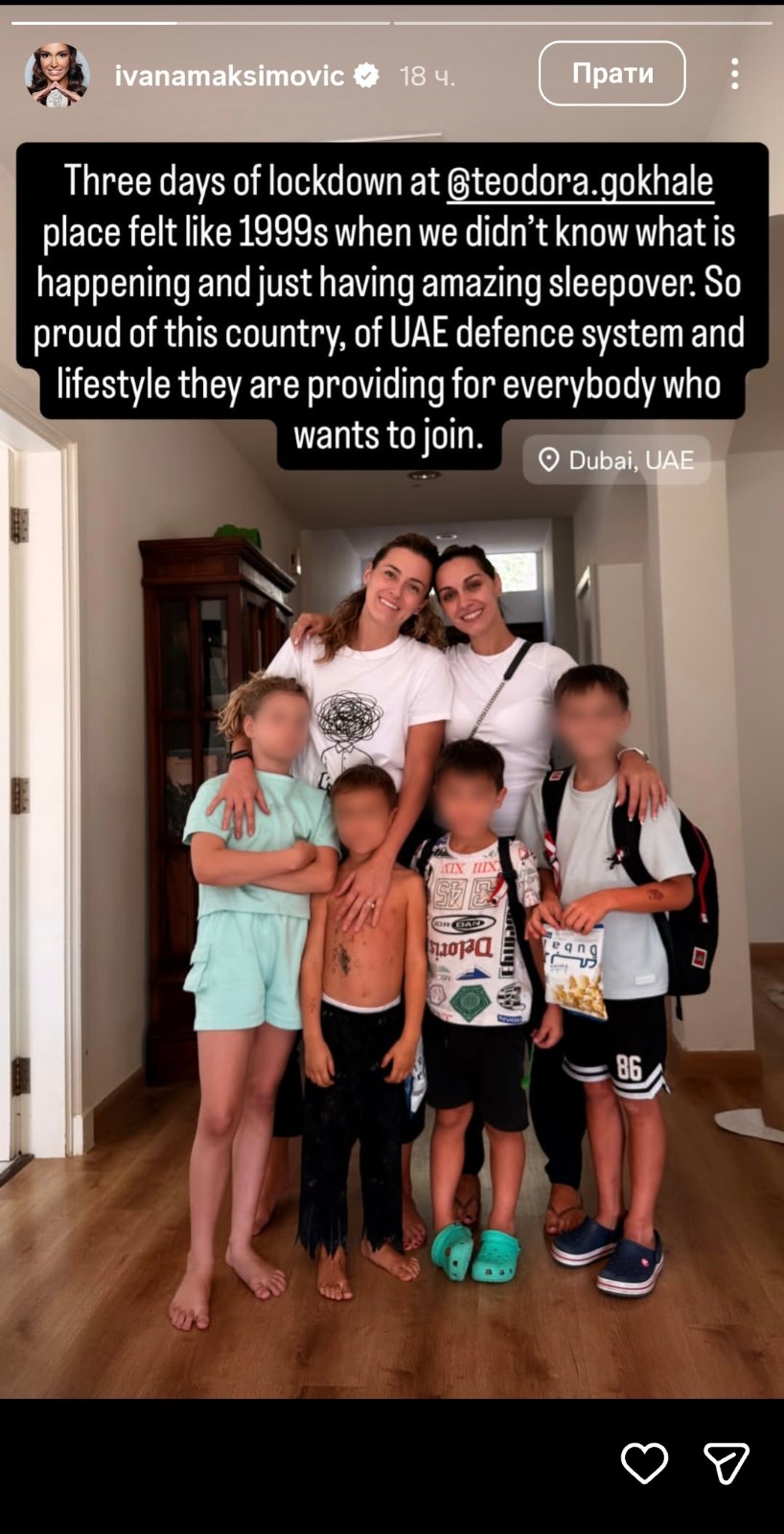 – „Tri dana karantina kod Teodore u kući. Osetila sam se kao 1999. godine, kada nismo znali šta će se desiti i imali smo sjajnu žurku sa prespavanjem. Ponosna sam na ovu zemlju i odbrambeni sistem Ujedinjenih Arapskih Emirata i način života koji pružaju svima koji žele da im se pridruže.“