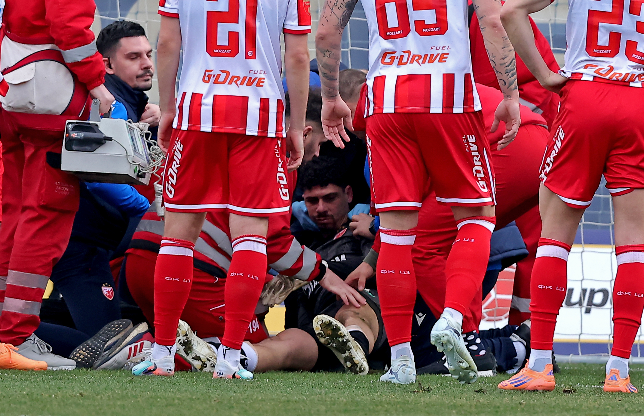 Golman Crvene zvezde Mateus na utakmici protiv Novog Pazara zadobio je snažan udarac u glavu zbog čega je morao da napusti teren i bude transportovan u bolnicu.