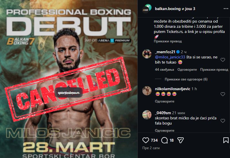 Ljubitelji borilačkih sportova očekivali su da Miloš Janičić 28. marta u Boru debituje u profesionalnom boksu, ali do toga ipak neće doći, pošto je borac iz Podgorice u poslednjem trenutku odustao od nastupa.