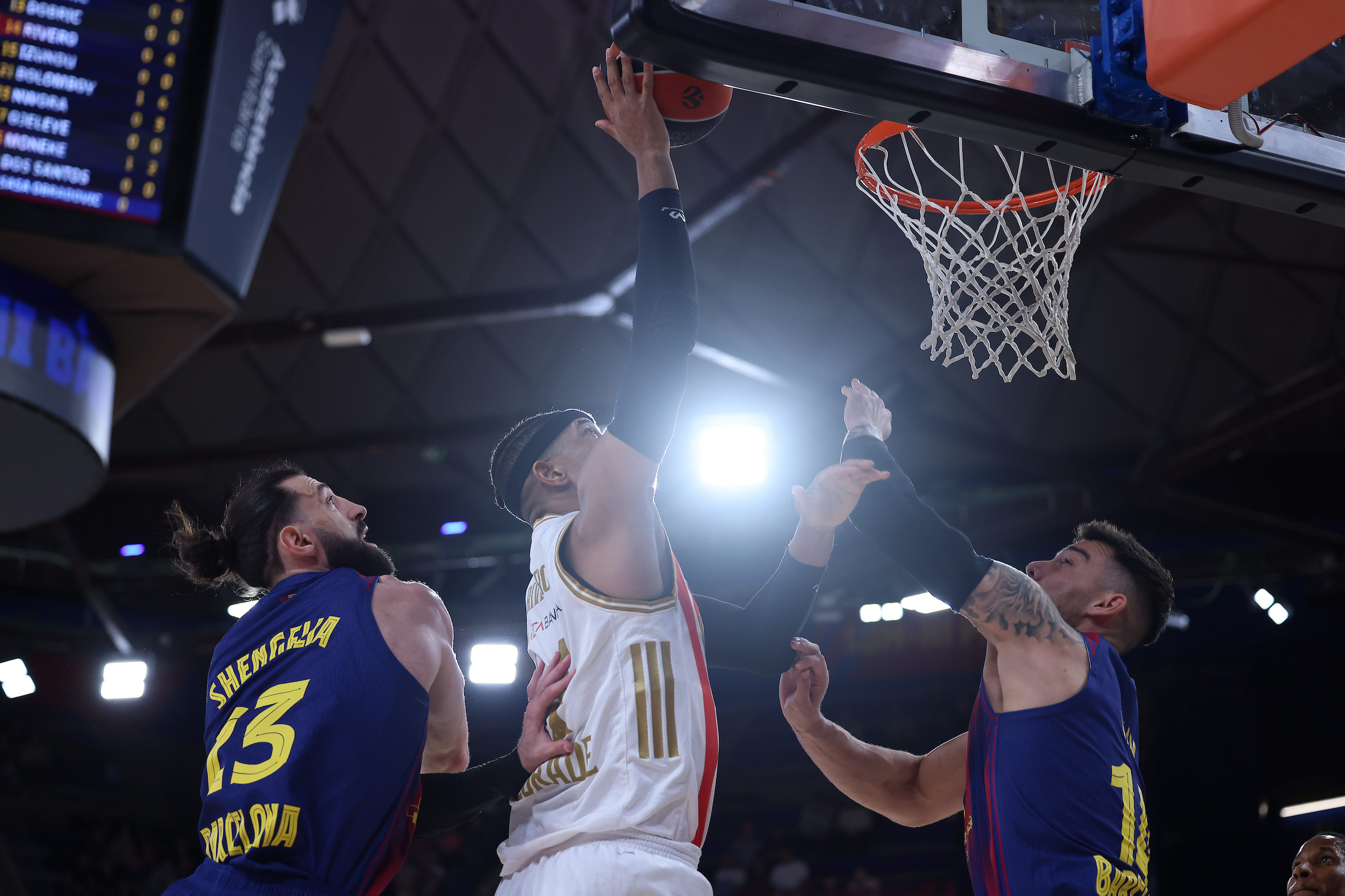 Zvezda potom uspeva da se odbrani, a Moneke dolazi do novih poena, pa crveno-beli smanjuju zaostatak na 40:35, ali Barselona i dalje kontroliše rezultat.