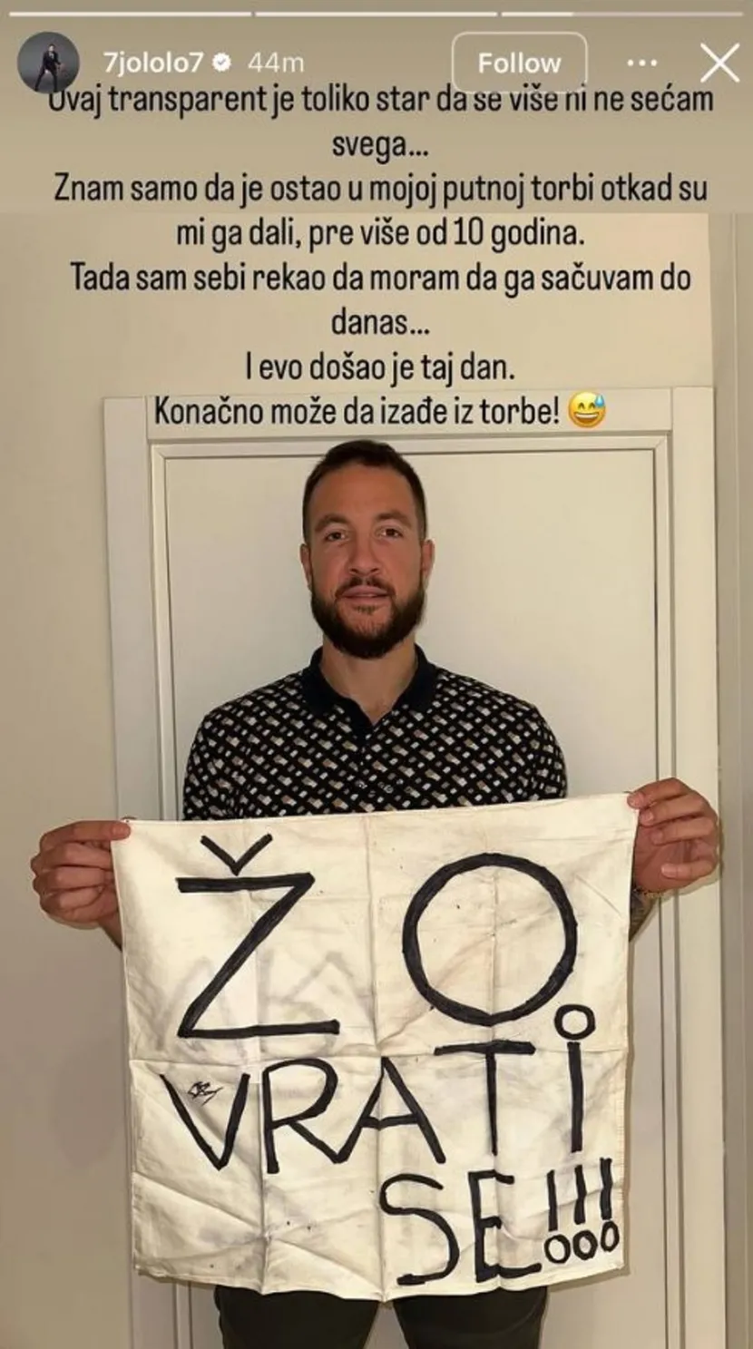 „Ovaj transparent je toliko star da se više ni ne sećam svega… Znam samo da je ostao u mojoj putnoj torbi otkad su mi ga dali, pre više od 10 godina. Tada sam sebi rekao da moram da ga sačuvam do danas… I evo došao je taj dan. Konačno može da izađe iz torbe“, napisao je Lovernj.